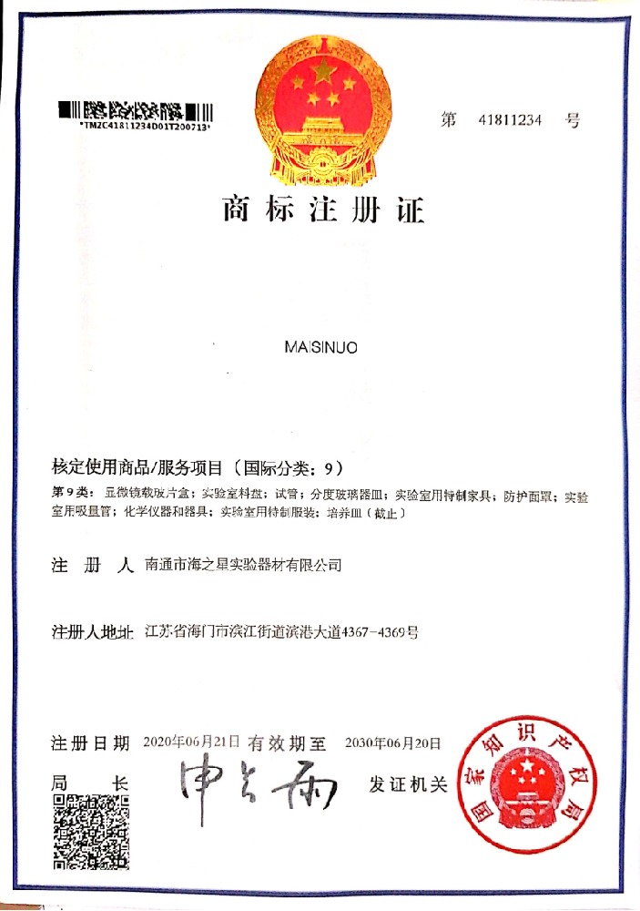 公司因發展需要,注冊麥斯諾英文商標——“Maisinuo”實驗室,